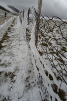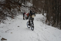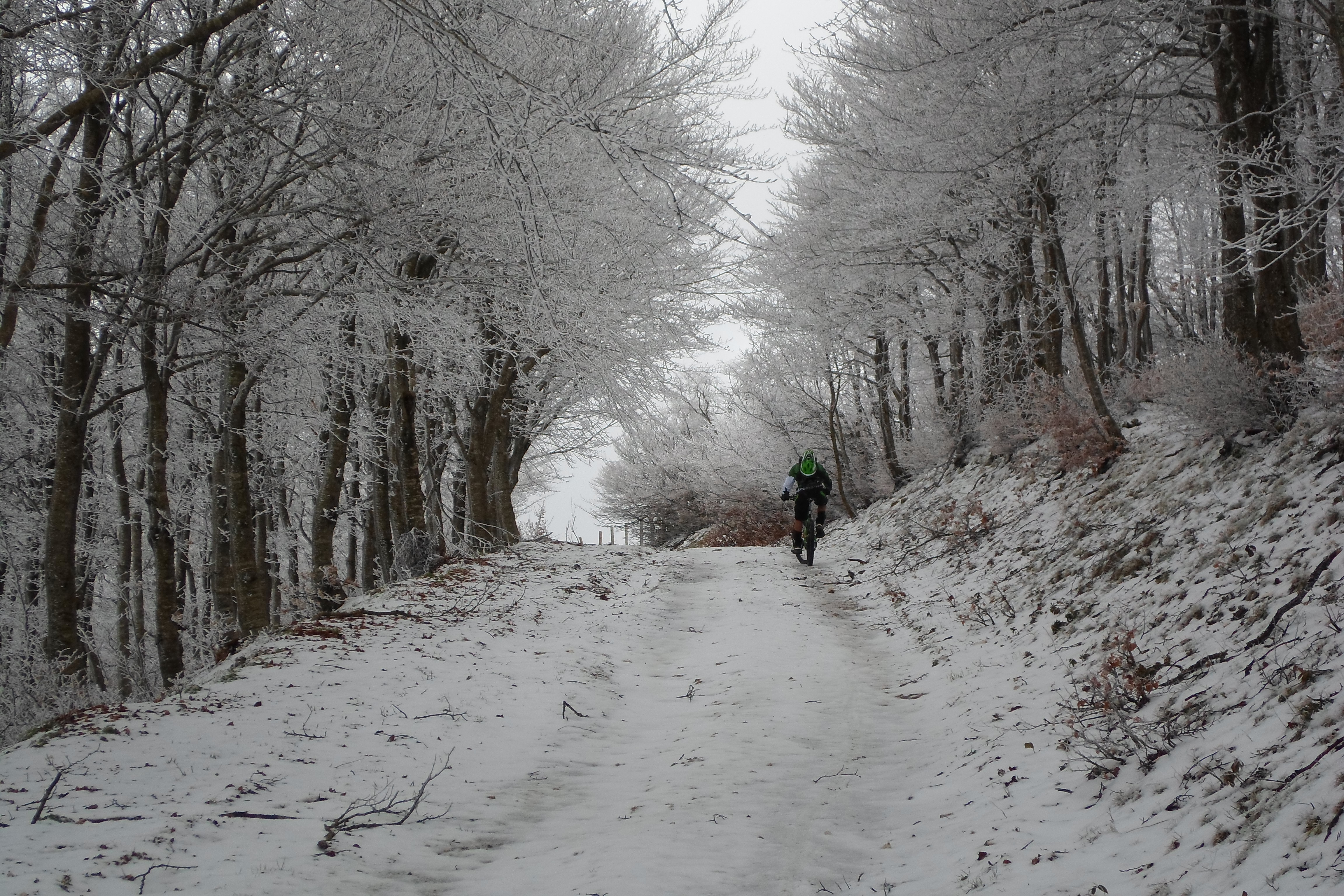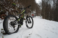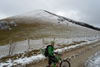 Convinti di aver risolto finalmente tutti i problemi tecnici, risaliamo in sella e raggiungiamo la quota neve, il panorama diventa subito uno spettacolo, tutto bianco! L’unica cosa a stonare in mezzo a cotanta bellezza è la sella del demonio dal colore improbabile e dal nome impronunciabile.