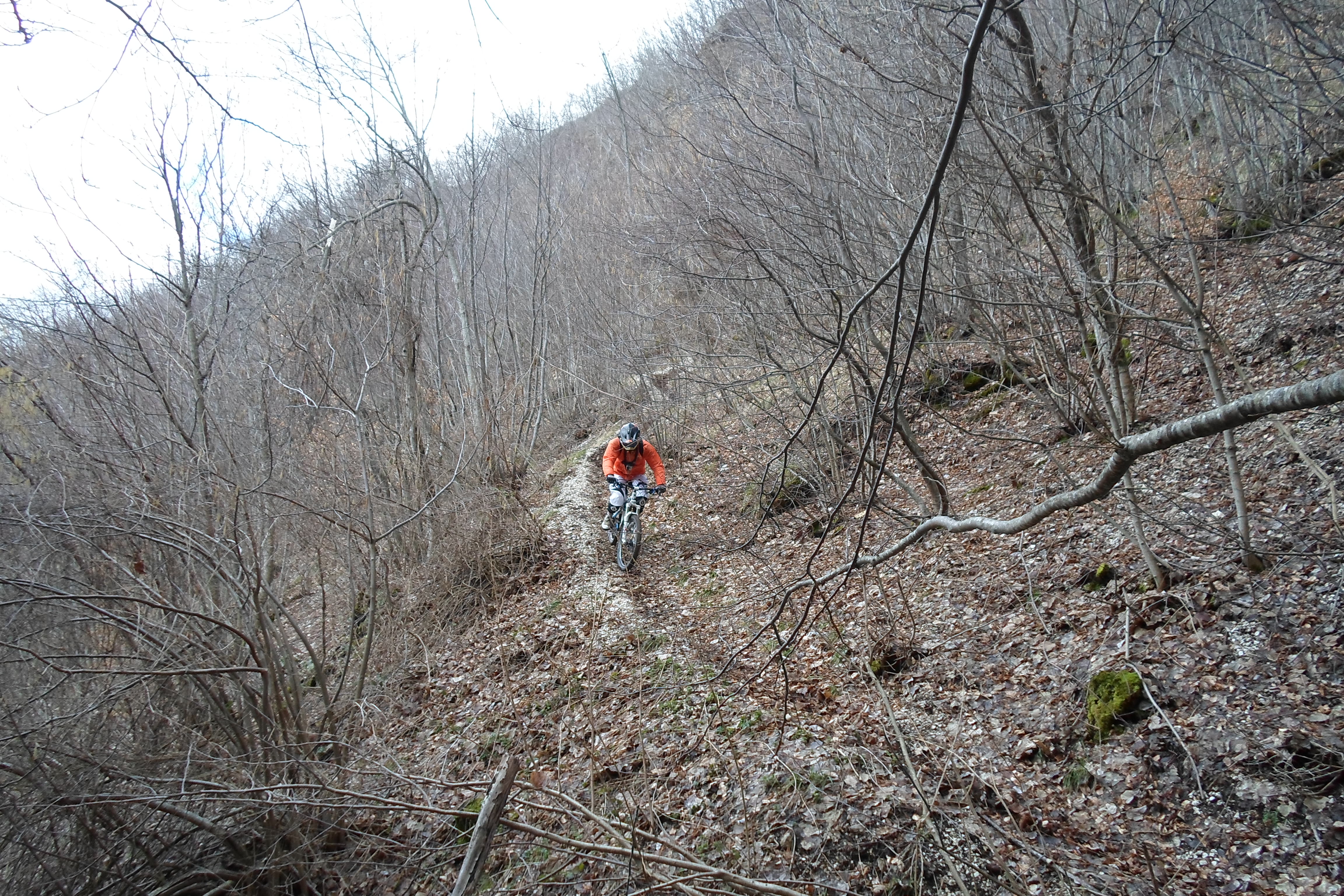 Dopo qualche centinaia di metri ci rendiamo però conto che la strada da percorrere per arrivare alle creste del sentiero 53 è ancora veramente tanta, di pedalare non se ne parla, ed il tempo a nostra disposizione è quasi terminato. La decisione è presto presa, si decide di ritornare sui nostri passi ed imboccare il sentiero all’altezza dell’acquedotto, improvvisando anche un taglio in mezzo al bosco.